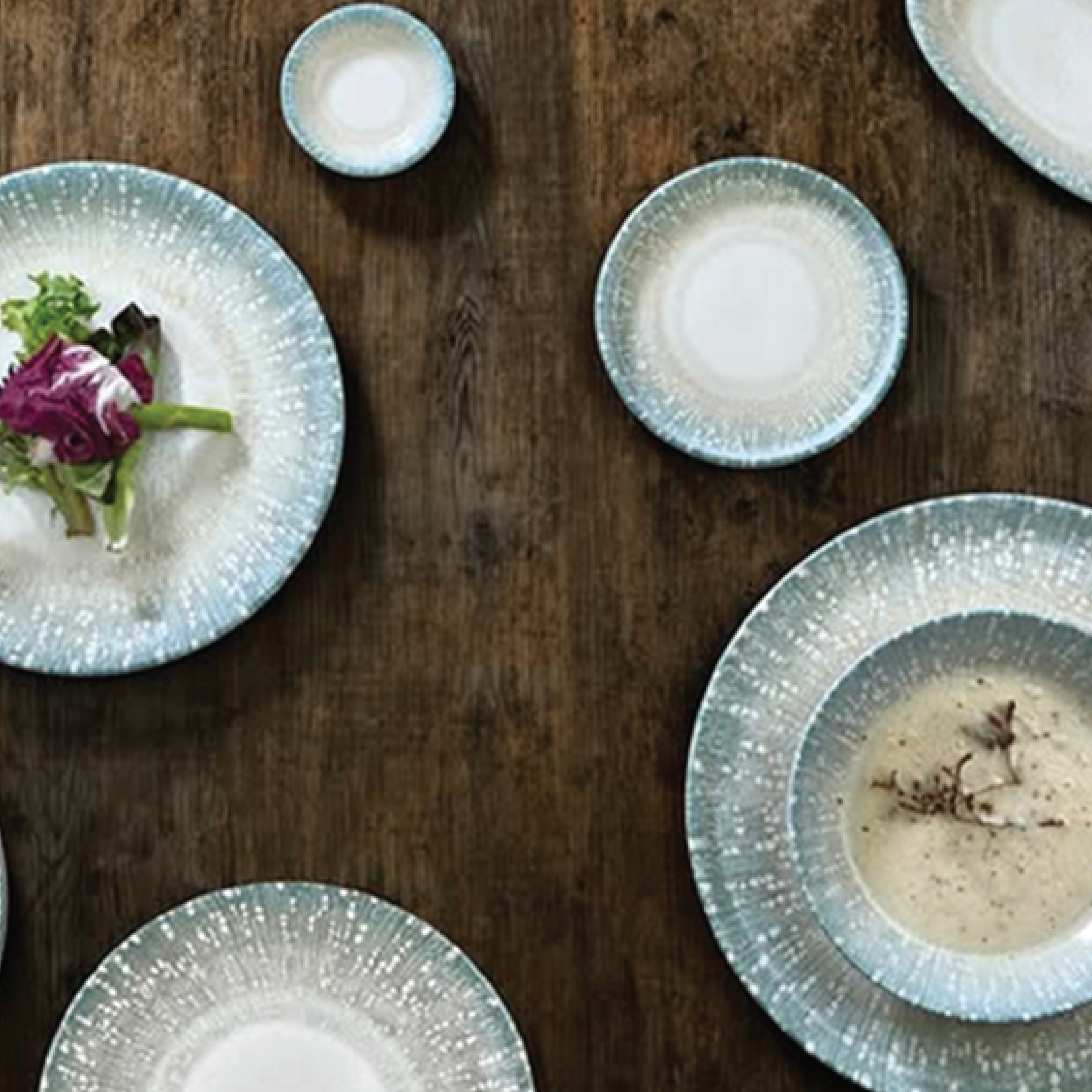 By bones collections, such as Helix Gleam, Mises, Balance, and Edera, blend clean aesthetics with reactive glazes and modern textures. From flat plates to deep bowls and trays, each piece is designed for both performance and visual impact.